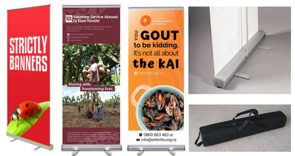 Our banner has two fold out feet for stability, two PVC banner prints and is supplied with a carry bag.